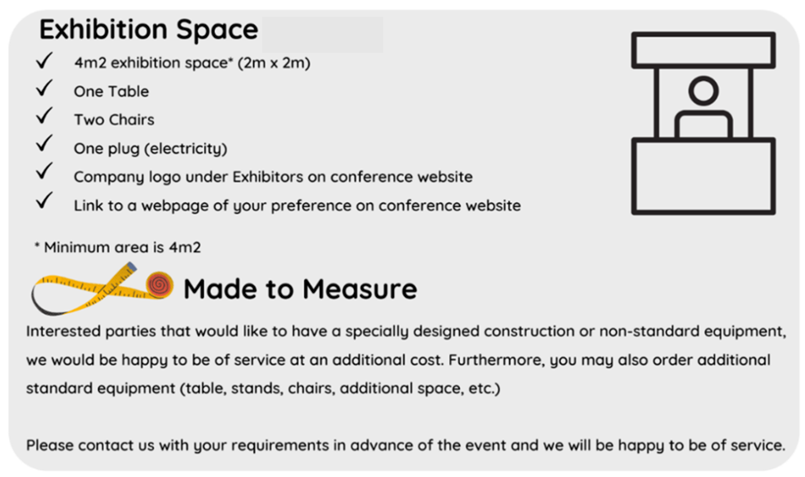 The cost of using the exhibition space is €500. In addition, presenters should be registered to the conference main event (see prices). Each slot includes a 2m X 2m space with a desk, two chairs and electricity. Presenting companies will be listed on the conference website with their logos.